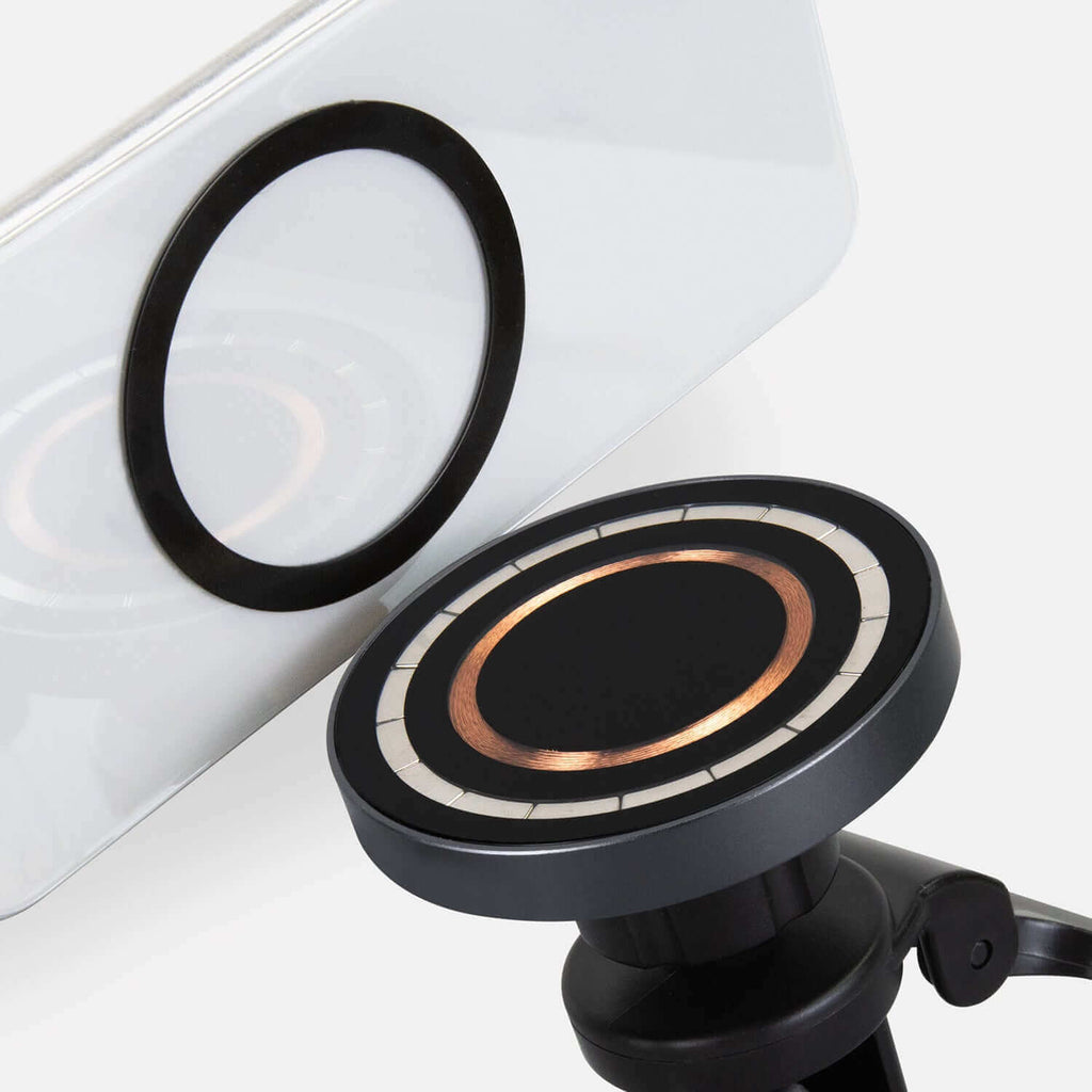 Introducing the INGENIO Arc Wireless Car Charger, a perfect blend of innovation and elegance designed for modern drivers. This 15W magnetic charger features a premium black glass finish with refined copper accents, making it a stylish addition to any vehicle.