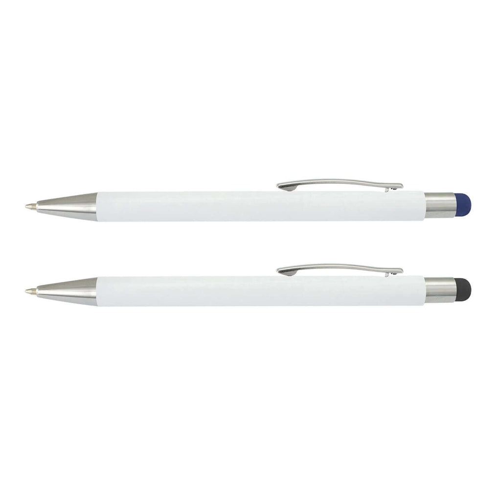 The Lancer Stylus Pen - White Barrel is a sophisticated writing instrument designed for both functionality and style. This retractable aluminium ballpoint pen features a sleek gloss lacquered barrel complemented by shiny chrome trim.