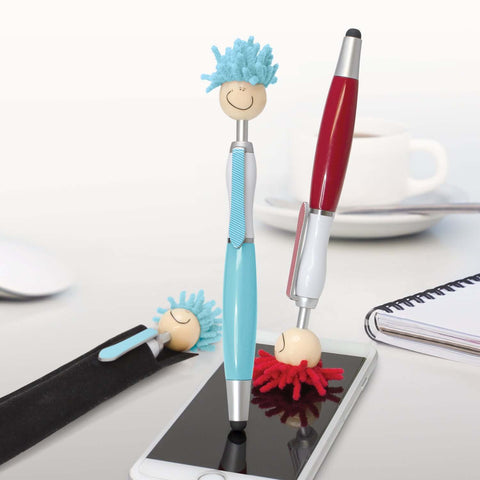 Introducing the Mop Topper Pen, a fun and functional novelty ballpoint pen that is perfect for everyday use. This unique pen features a smiley-faced head with microfibre hair, making it an excellent tool for cleaning screens while you jot down notes.