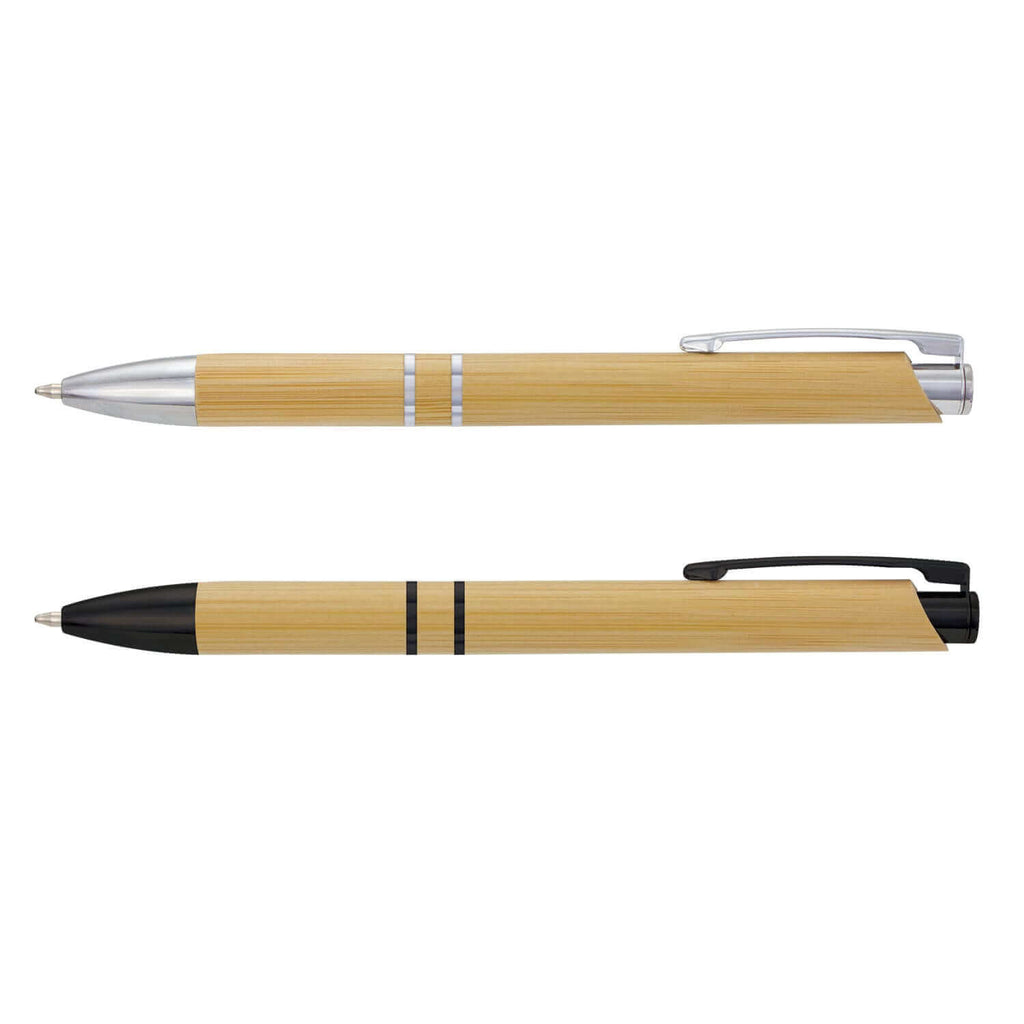 Introducing the Panama Bamboo Pen, a perfect blend of sustainability and elegance. Crafted from eco-friendly bamboo, this retractable ballpoint pen features a sleek barrel adorned with shiny chrome trim, making it a stylish addition to any desk.