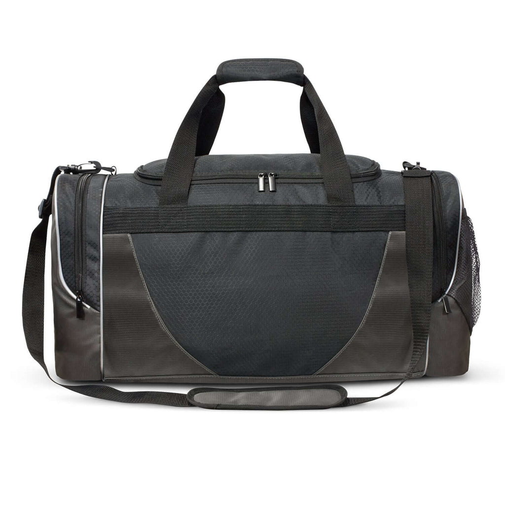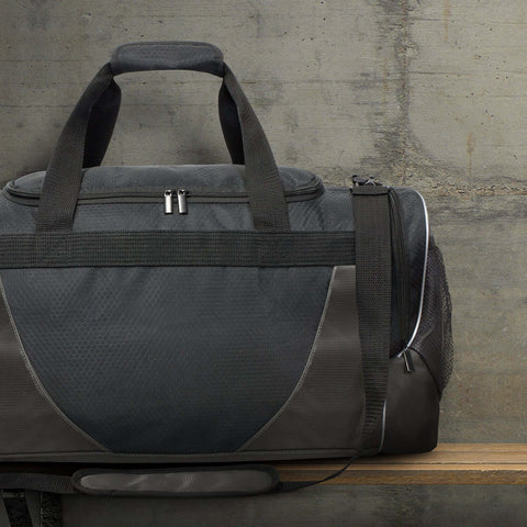 The Excelsior Duffle Bag is a superior large bag crafted from durable gunmetal-colored 600D polyester, featuring stylish black ripstop nylon accents and sleek silver piping. Its strong woven carry handles come with a Velcro cuff, while the adjustable and removable shoulder strap adds versatility.