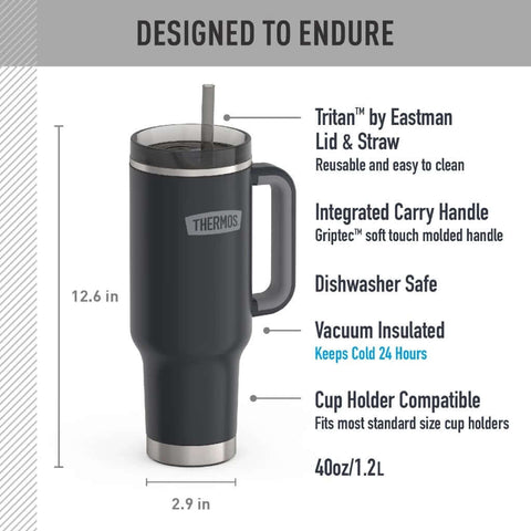 This mug fits in most standard cup holders, making it an ideal travel companion. Featuring advanced Thermos vacuum insulation technology, a slide lock lid, and a Griptec non-slip base, it ensures convenience and reliability.