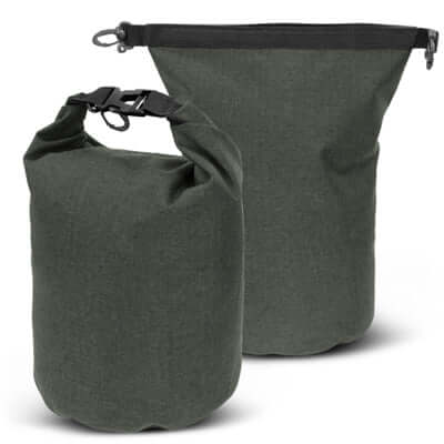 Crafted from durable 300D polyester, it features heat-sealed seams and a stylish two-tone heather finish. Its user-friendly design allows you to roll down the top closure several times and secure it with a snap lock, ensuring a reliable water-resistant seal.